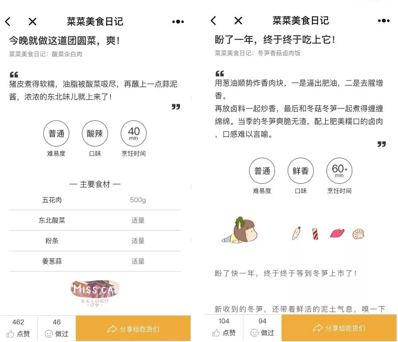与一些内容类小程序简单的搬运和归类不同,“菜菜美食日记”的小程序加入了不少有趣味性和互动性的玩法。