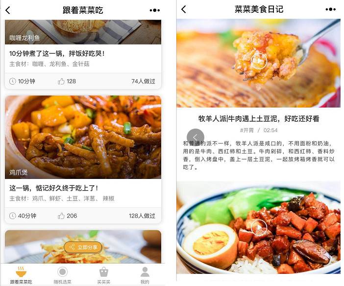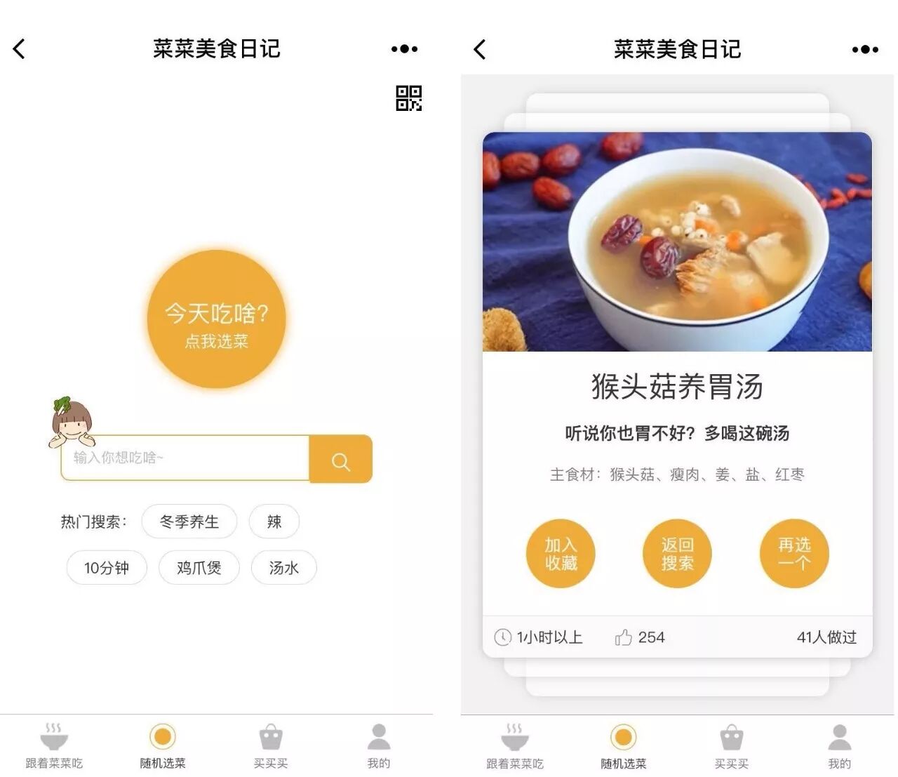 今天我们要介绍的小程序来自美食类大号 “菜菜美食日记”,经过三个月的酝酿,这款兼具搜菜谱、随机选菜、电商等功能的小程序最新版本在上周五正式上线。