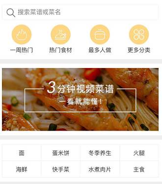 一些美食公号依靠精心制作的菜谱,获得了大量的关注,不过受制于公号推送的条数和呈现方式,这些菜谱信息比较分散,跟用户的互动也有所局限。小程序为美食号提供了新的施展空间,比如 “美食台”“下厨房”都已经上线了小程序,主要提供的功能是菜谱分类/专题,菜谱搜索等。