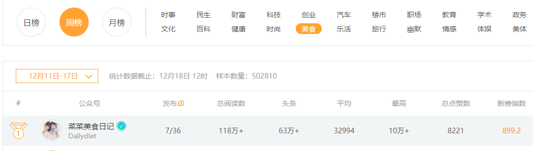 在新榜的榜单上,“菜菜美食日记”常常位于美食类公号头部