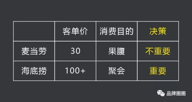 另外,人们去麦当劳,很多时候仅仅是为了“果腹”——随便吃一点就行;而去海底捞,一般都是朋友聚会——是相对重要的时刻。