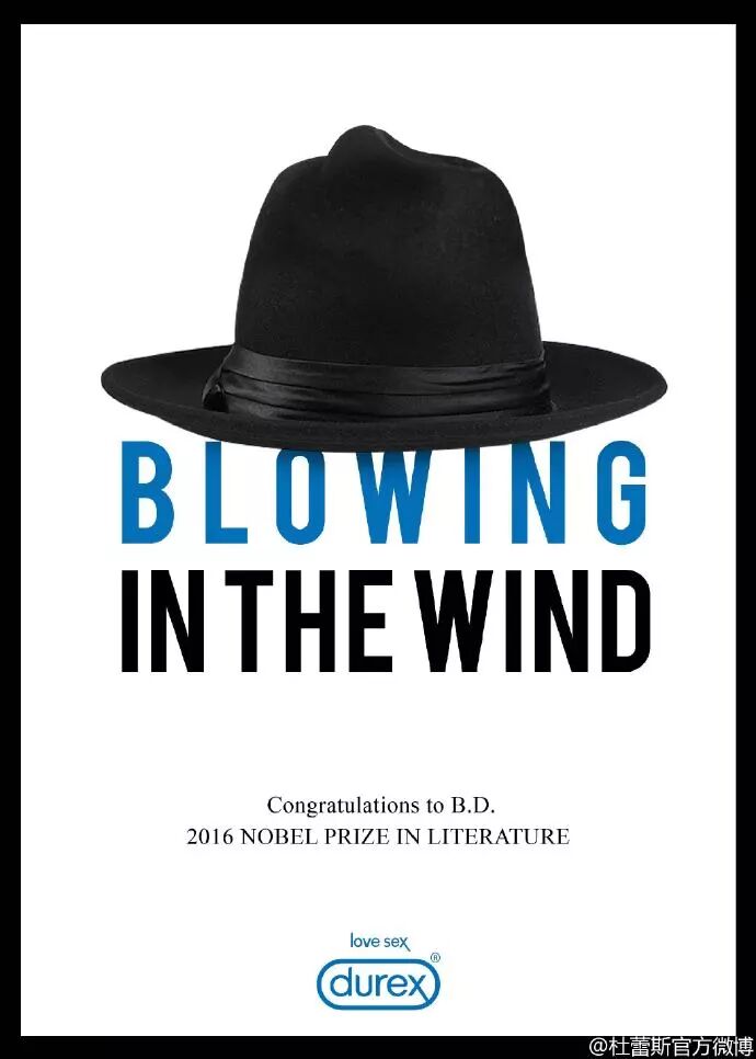 例如杜蕾斯在鲍勃迪伦获诺贝尔奖的热点借势中,把象征着鲍勃迪伦的帽子,通过对顶部进行小小的拉伸,整个帽子在视觉上就具有了杜蕾斯套套使用时的形状,既借了热点的势,又凸显了产品。