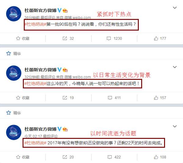 我们仔细观察杜蕾斯的官方微博,会发现每天都有新鲜热辣的话题等着粉丝参与讨论。从与避孕套等核心产品有关的广告话题,到情感、两性的用户话题,再到生活中各种话题,杜蕾斯总能找到或有趣或新奇或扎心的切入点,以简单的几句文案作话题引导,或引发粉丝共鸣、或刺激粉丝的好奇心与探知欲、或勾起粉丝的表现心理,总能让消费者积极、主动地参与回复和讨论。