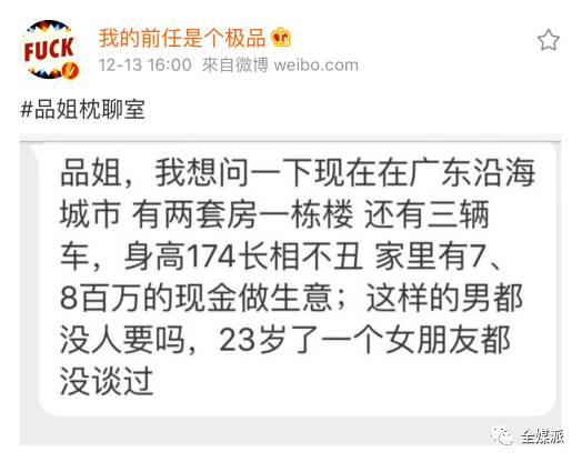 但有一个简单的问题是,活动究竟如何能达到最佳的效果,使用户愿意参加?大V博主们将话题设置的权利交给用户。作为以接受投稿为主的博主,@我的前任是个极品就将这种玩法发挥得淋漓尽致。“品姐枕聊室”省略了博主设问的环节,直接截图来自读者的私信提问。这种树洞式的互动方式以生活实例为内核,评论区往往吐槽与同感齐飞,达到良好的互动效果。