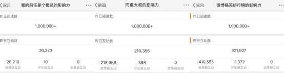 情感向设问、跨人群沟通、社交化传播,共同构建出了有影响的“一句话”。根据微博数据,设问套路玩得飞起的几位博主每天都能收获超百万阅读量,互动数更高至40万+,可谓生动诠释了用户运营的显著成效。