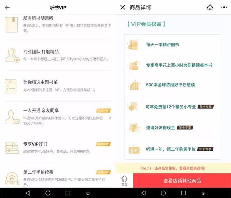 产品提供的权益比较相似,都是一年可以听将近400本书籍,有很多免费的小权益,第二年半价续费。由于得到的听书是最先推出来的,难道是新世相模仿了下罗辑思维的得到?