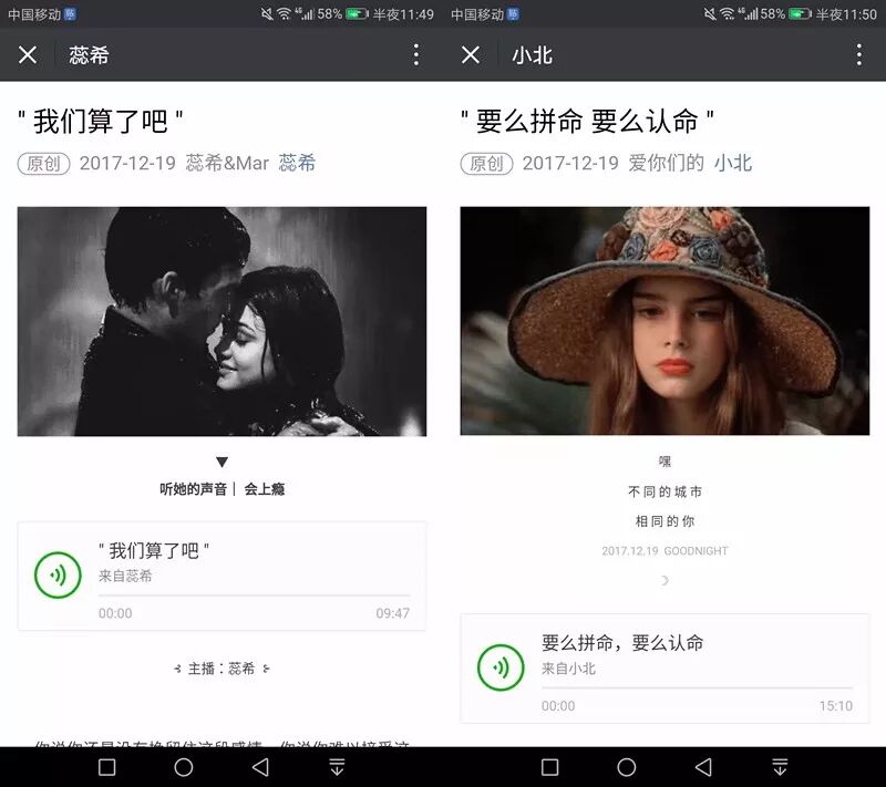 两个公众号风格及人设极其相似,推送的都是原创情感文章,更新的篇数相似,公众号名字都是两个字且都是人名,标题字数篇幅相似,文风都偏治愈系。
