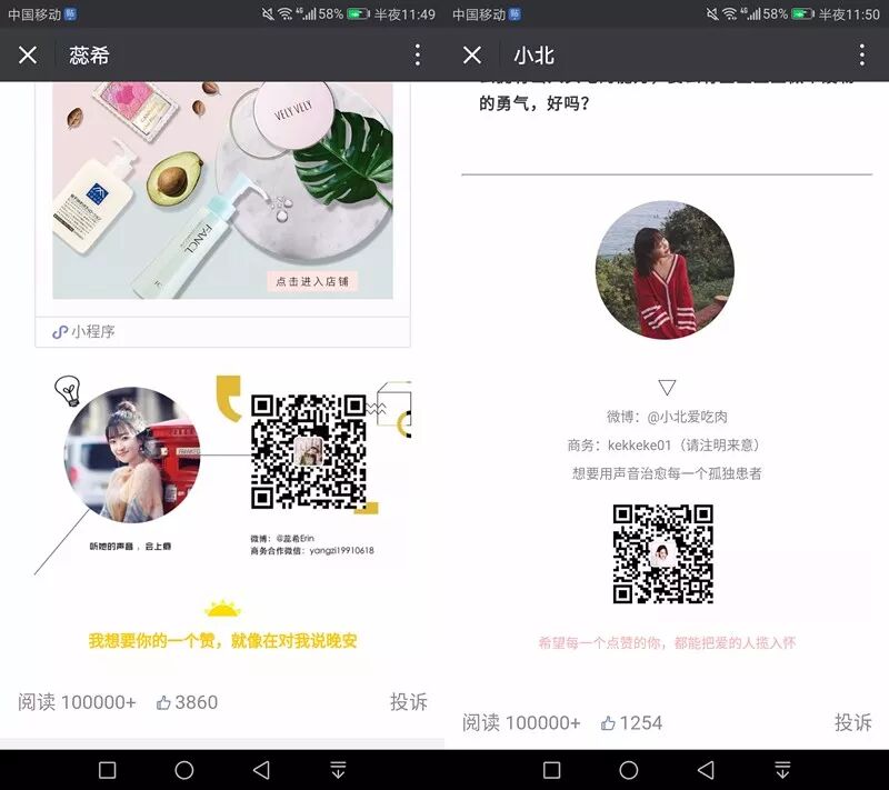 更加雷同的地方还有,文章尾部两个人都留下了一个圆形头像+微博名字+商务联系方式+二维码,难道情感类的博主都这样吗?