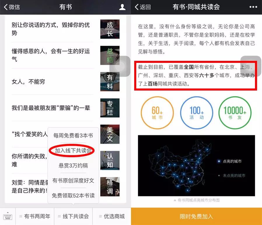 有书策划过一些活动,比如在建群的早期,为了增加用户分享社群的动力,会在用户分享社群之后,赠送给用户一些精美的电子书。这就带动粉丝滚雪球似的增长,这些社群遍布全国六十多个城市,从而吸引线下书友加入。