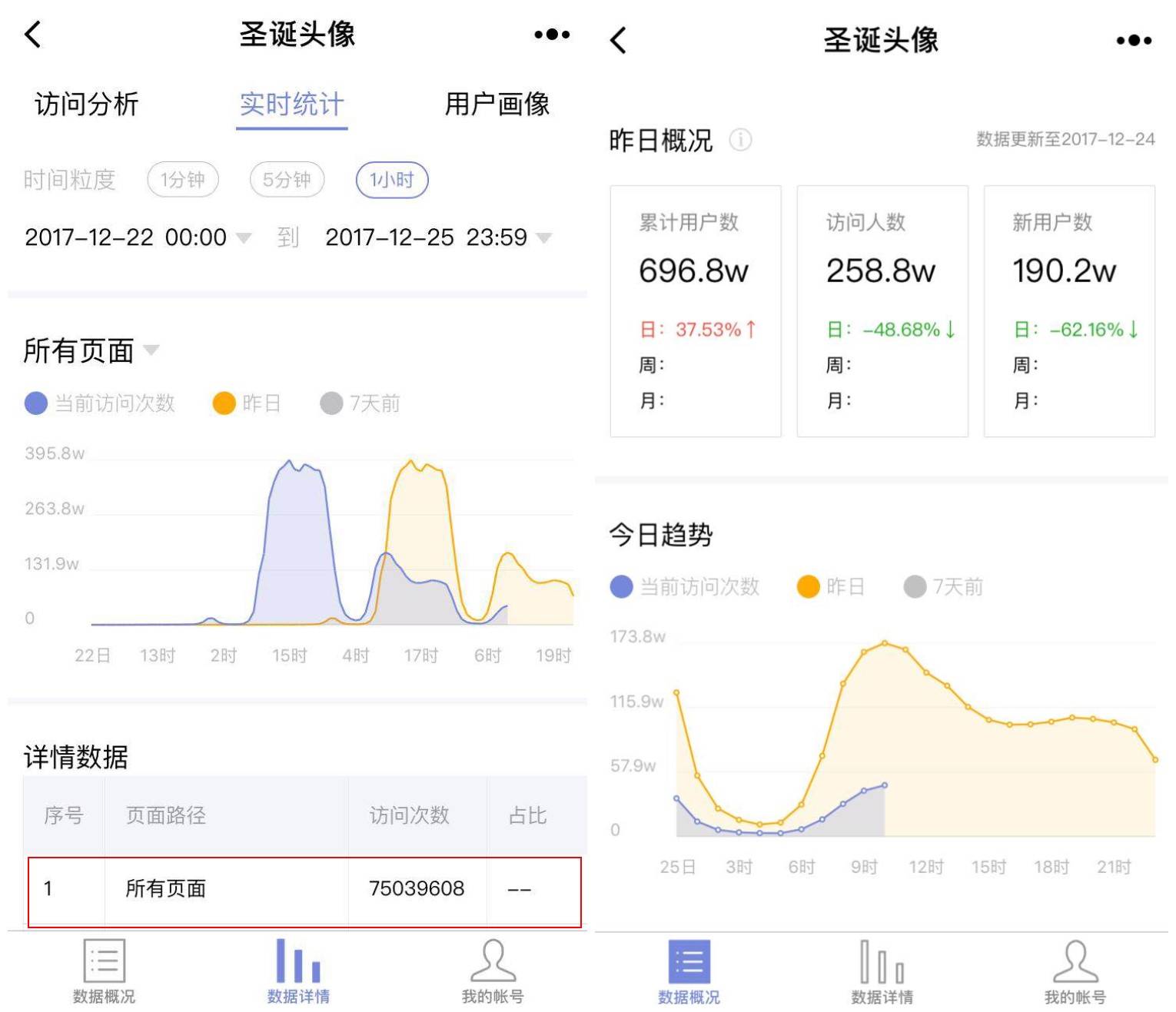 在制作圣诞帽的过程中,很多小程序也借势火了一把。其中,“圣诞头像”3天PV破7500万,累计用户近700万,几乎可以说是这波借势的最大受益者。