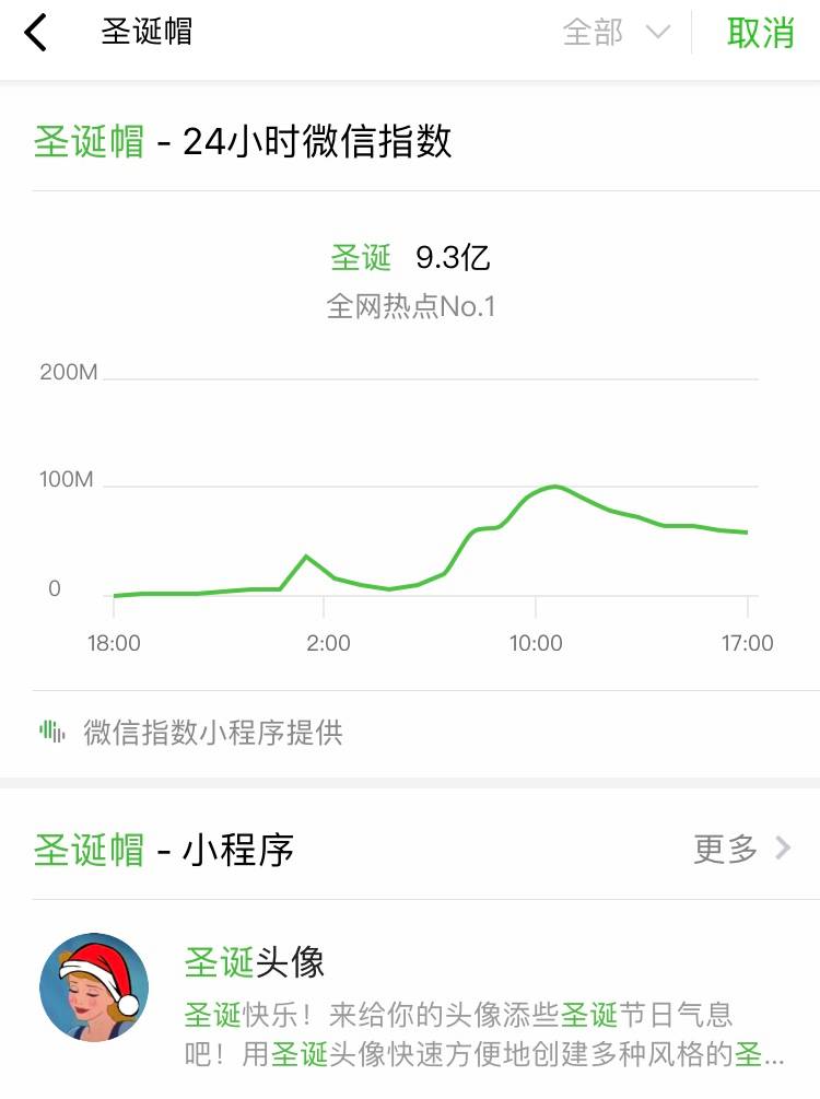 上线后在12月23日11时获得了微信搜索“圣诞帽”的第一位推荐,当时有9.9亿的微信指数。