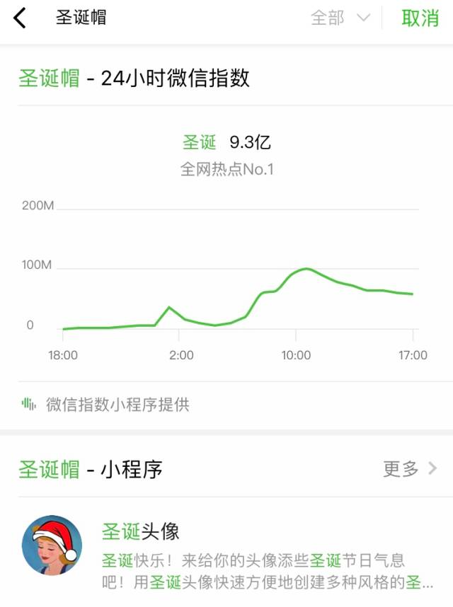 小程序“圣诞头像”开发者赵团结认为,“圣诞头像”之所以能获得超7500万的PV,离不开“官方加持”。除了小程序名字就叫“圣诞头像”,符合爆款应用的气质。小程序的描述也很关键,在40多字的描述语中,出现了4个“圣诞”关键词。因此,得到了微信搜索“圣诞帽”的第一位推荐。