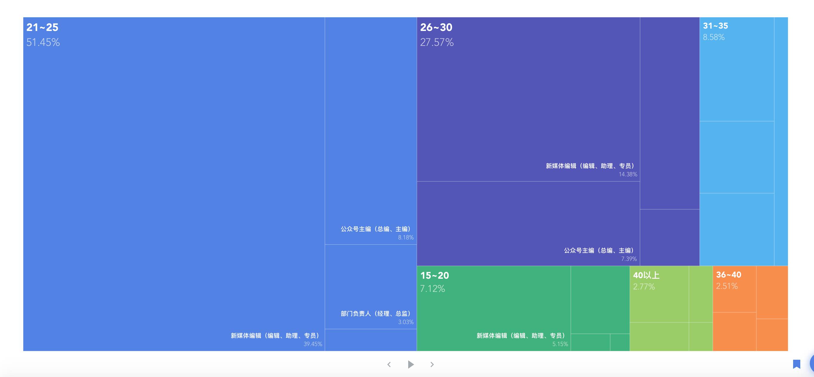 而从调查的结果来看,90后占据了新媒体半壁江山,超过半数的运营者年龄在25岁以下。其中有64.75%还是新媒体小编,令人意外的是有17.44%的90后已经在极短的时间内成长为了部门主管,甚至是创业公司的大佬。