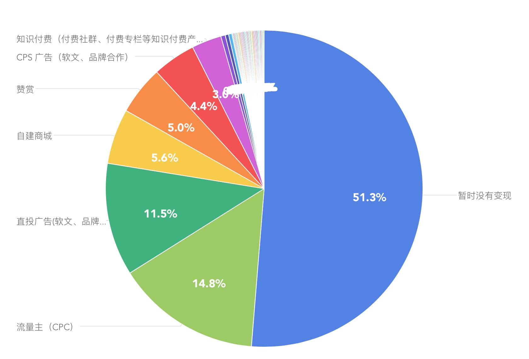除了流量主和直投广告之外,越来越多自媒体人开始尝试多元的变现方式。2016被称为知识付费的元年,从2016下半年到2017年,越来越多公众号运营者通过知识付费获得了可观的收益。在参与问卷调查的用户当中,3.04%的公众号通过知识付费的方式获利,其中51.8%实现了月收入5000+甚至破万。