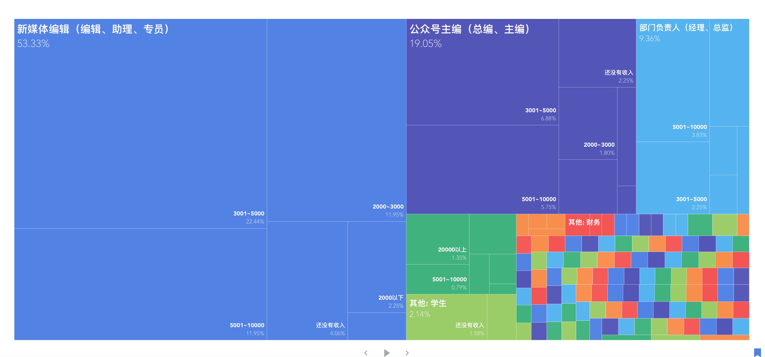 从收入情况的来看,大部分新媒体小编的薪酬都稳定在3000~5000元之间,月收入5000以下的新媒体编辑占到了总量的76.32%,但随着职位职能的升高,新媒体主编、高级新媒体运营人才、部门主管、总监的平均薪酬均超过了5000元,核心运营职务的月薪甚至高达20000元,是普通编辑的5倍以上。