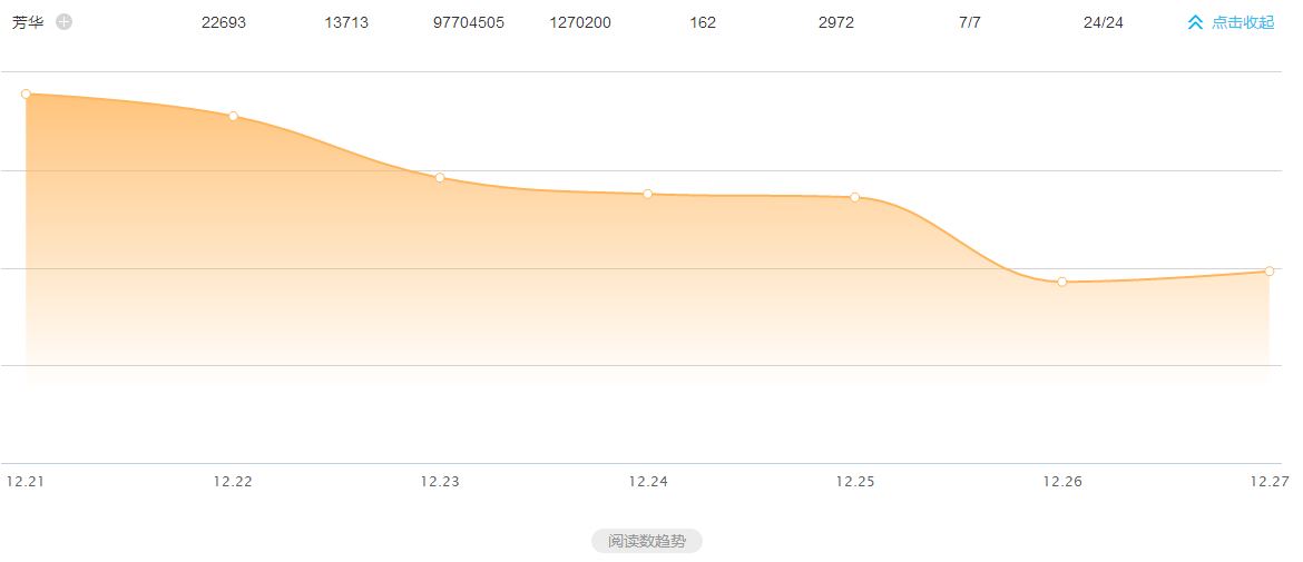 据新榜趋势查询,截至12月27日,含有“芳华”关键词的文章共有22690篇(约2.3万),其中达到10w+的文章有162篇。