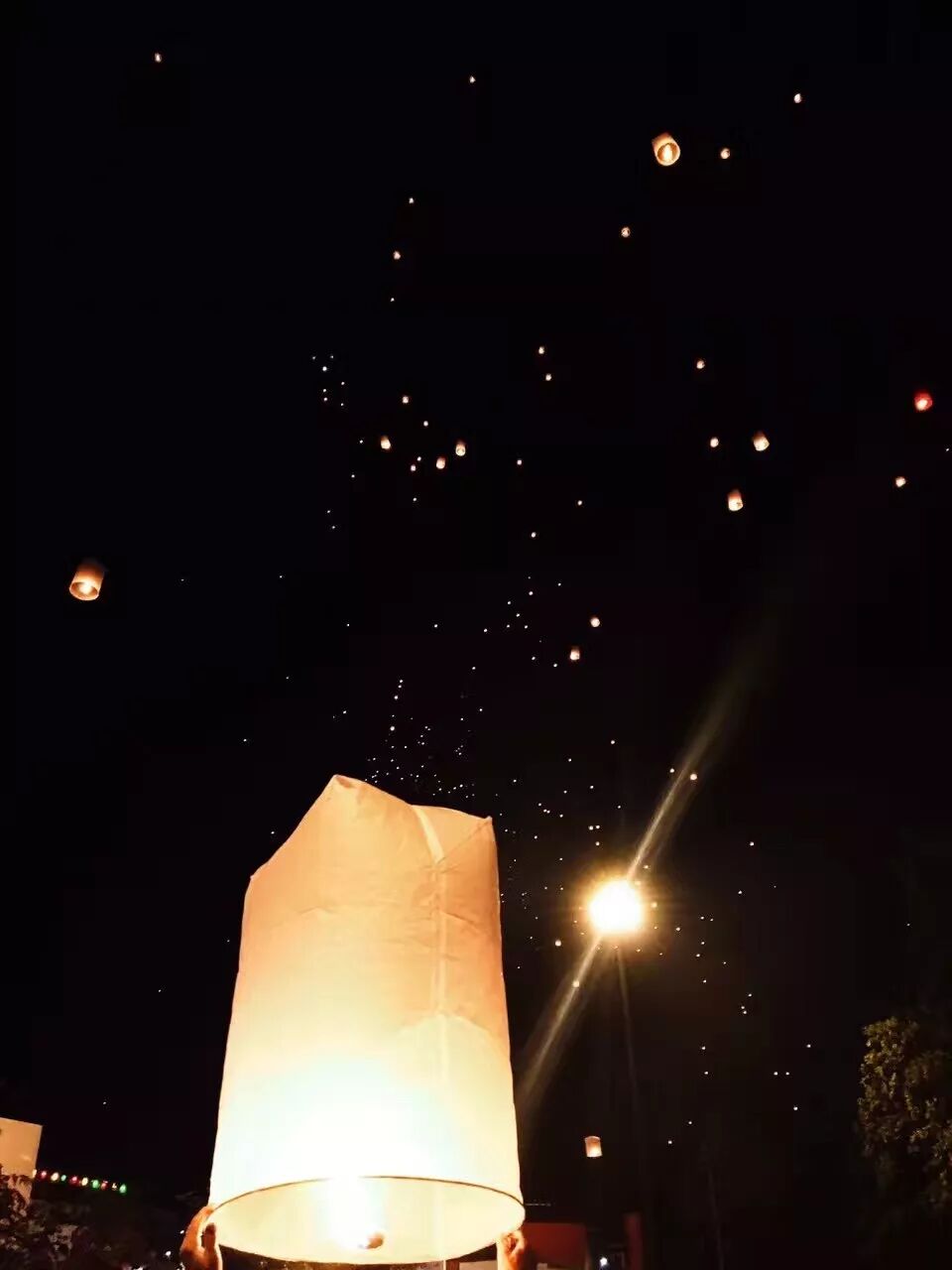 山顶很暗,我们可以看到整个清迈的夜景,陆陆续续有天灯飘上来,一盏又一盏灯光浮动。我们坐着石板凳上像朋友一样聊天。