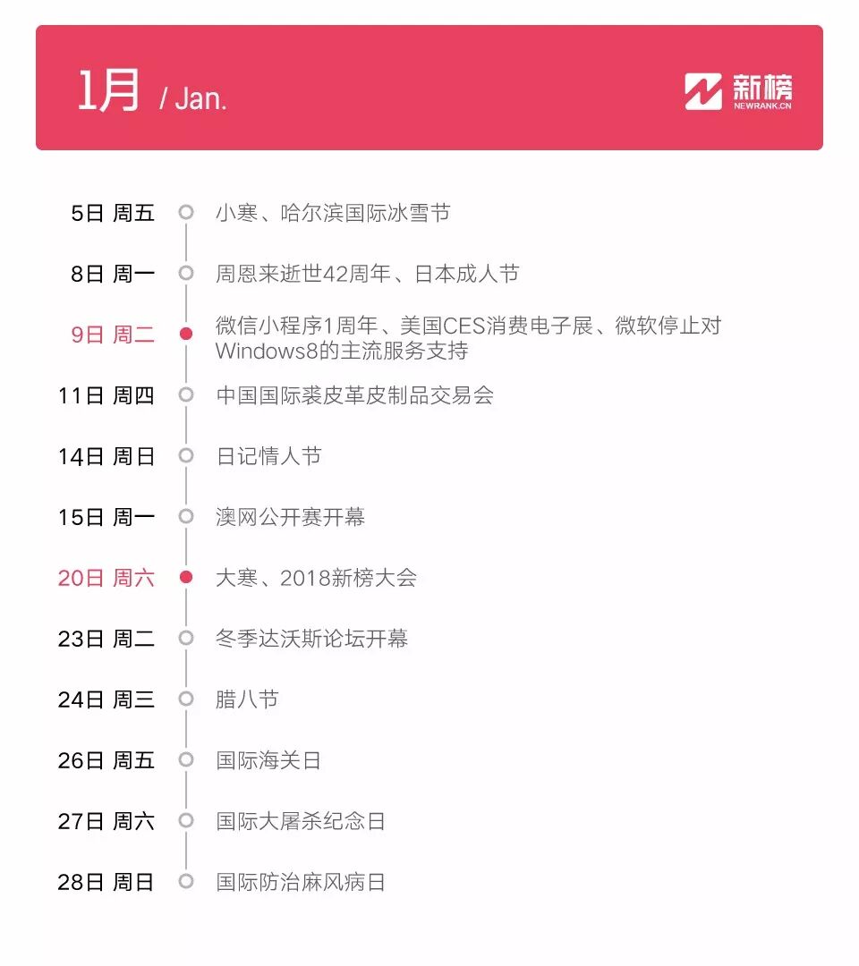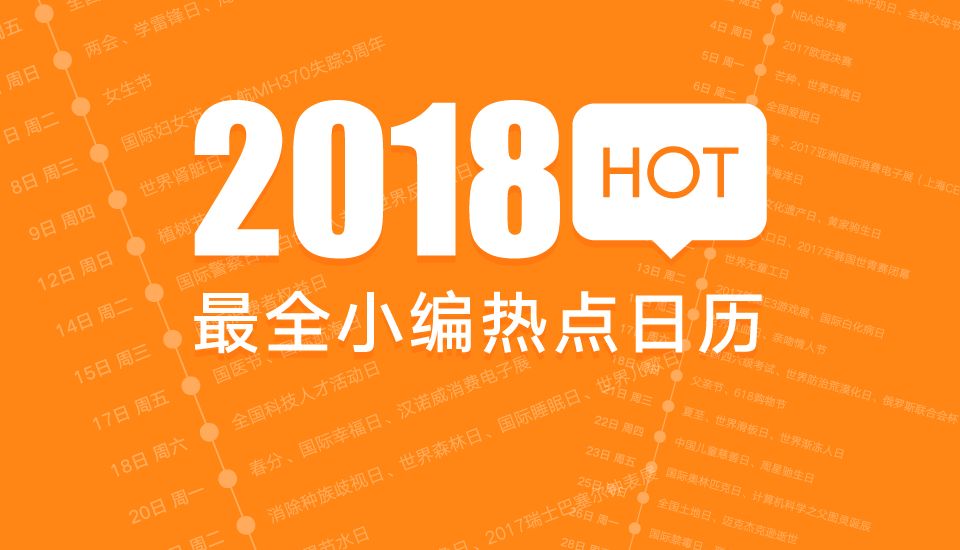 为方便大家提前做好蹭热点的准备,榜哥榜妹再度综合各家“热点日历”之所长,量身打造了一款适合新媒体小编的“2018年最全小编热点日历”,助你一臂之力!