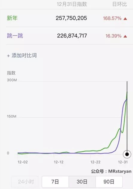 这张微信指数对比图尤其说明其火爆程度。“跳一跳”的微信指数从28号上线以来一直高于“新年”。即使12月31日跨年夜也无限接近“新年”。