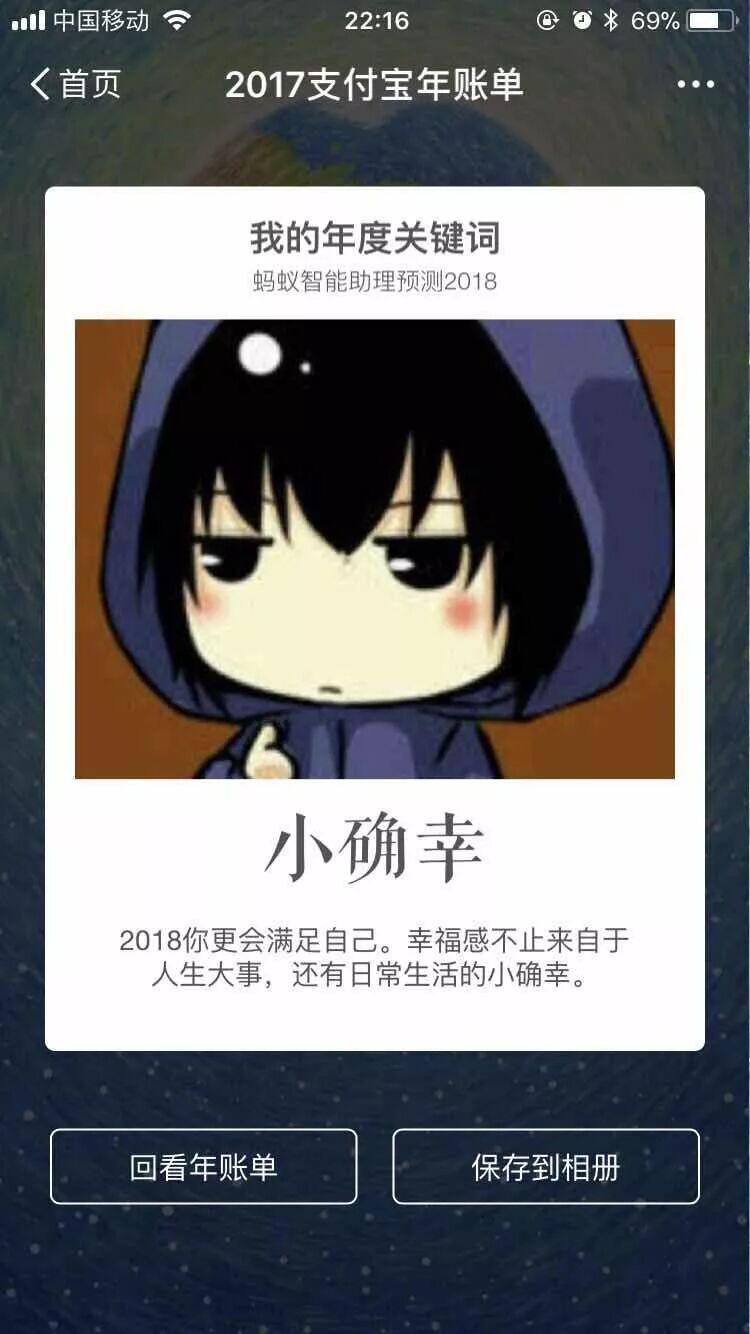 再看支付宝账单,最有魅力的在于账单的结尾,支付宝根据用户过去一年的消费习惯生成了2018年度关键词,以至于掀起了一波猜测支付宝生成关键词来源的风潮。虽然是段子,但这背后同样折射出数据个性化展示的重要价值。