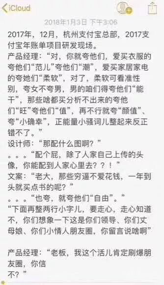 这就是赤裸裸的满足用户虚荣心,谁不想让别人知道自己“有钱”呢?支付宝最后的年度关键词预测,也是颇有心机,虽然这是个段子,但背后的道理想必也就是这样吧,自己领悟一下。