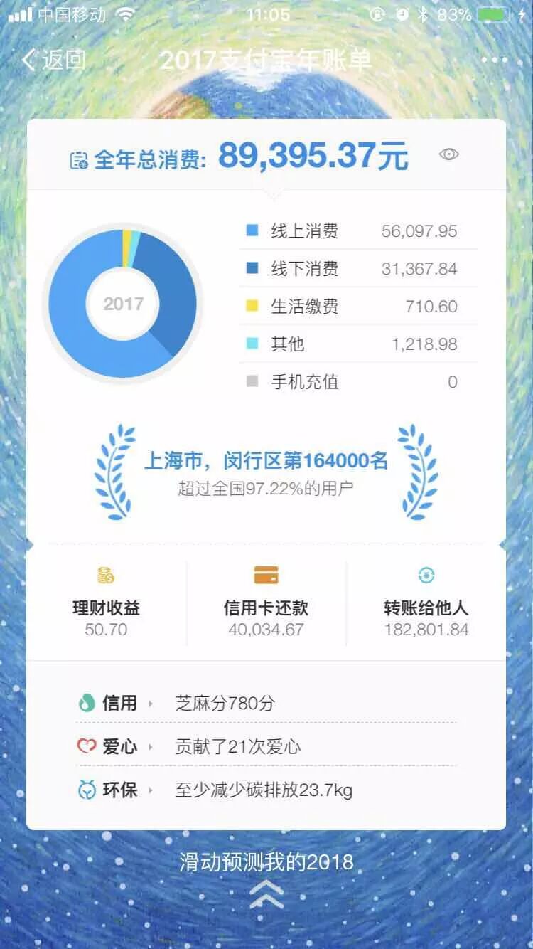 最牛逼的还得数支付宝。支付宝的个人年度账单一出,屌丝直接变土豪啊。年度消费集体10万起步,低于10万都不好意思晒朋友圈啊,比如我。