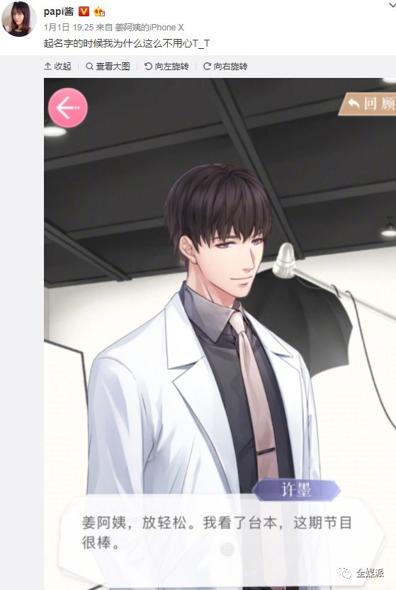 借着《恋与制作人》的热潮,papi酱多了个“姜阿姨”的梗。“阿姨”一词与乙女游戏形成的反差,为她成功制造了“恋与老阿姨”的笑点。