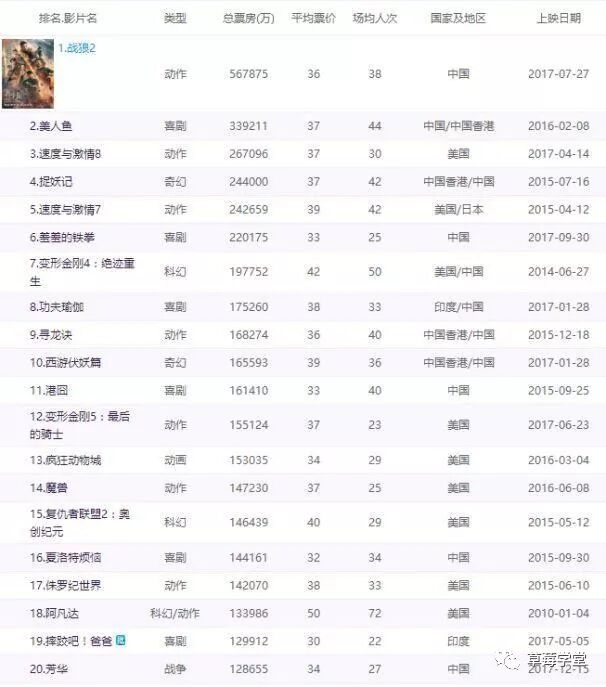 国内电影票房排名前 20 的电影中,就有 6 部是纯喜剧电影,其它 13 部电影(除了《芳华》)也都大量融入了喜剧元素。