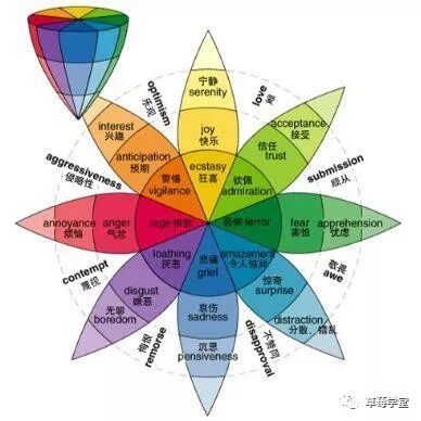 每种颜色代表一类情绪,颜色越深,情绪越强;相对的色块表示相对的情绪;“情感之轮”还展示了不同的情绪是如何融合并创造新的情感,比如,“害怕”和“信任”融合,产生了“顺从”;“快乐”和“信任”融合,产生了“爱”。图片来源:漫谈情感化设计。