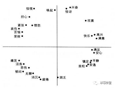 上方为高唤醒情绪,下方为低唤醒情绪。左边为消极情绪,右边为积极情绪。来源:James A.Russell,1980