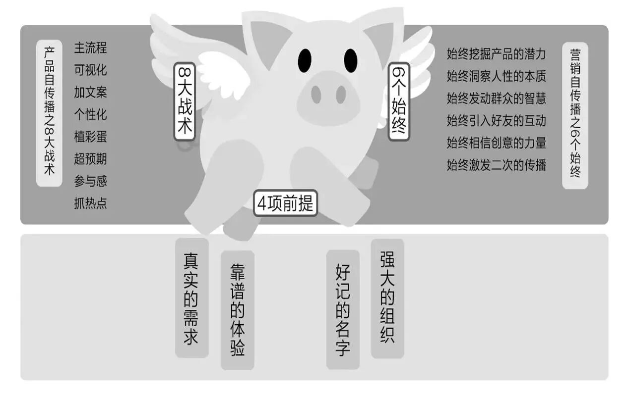 “小猪的翅膀”则是说:让小猪能够飞上天的8大战术,即如何把自传播的机制注入到产品当中,让产品自己会说话。