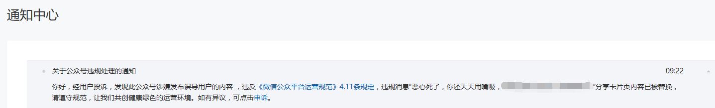 并且公众号也收到了来自官方的警告:违反了《微信公众平台运营规范》4.11条规定,涉嫌发布误导用户的内容,文章的分享卡片页内容已被替换。