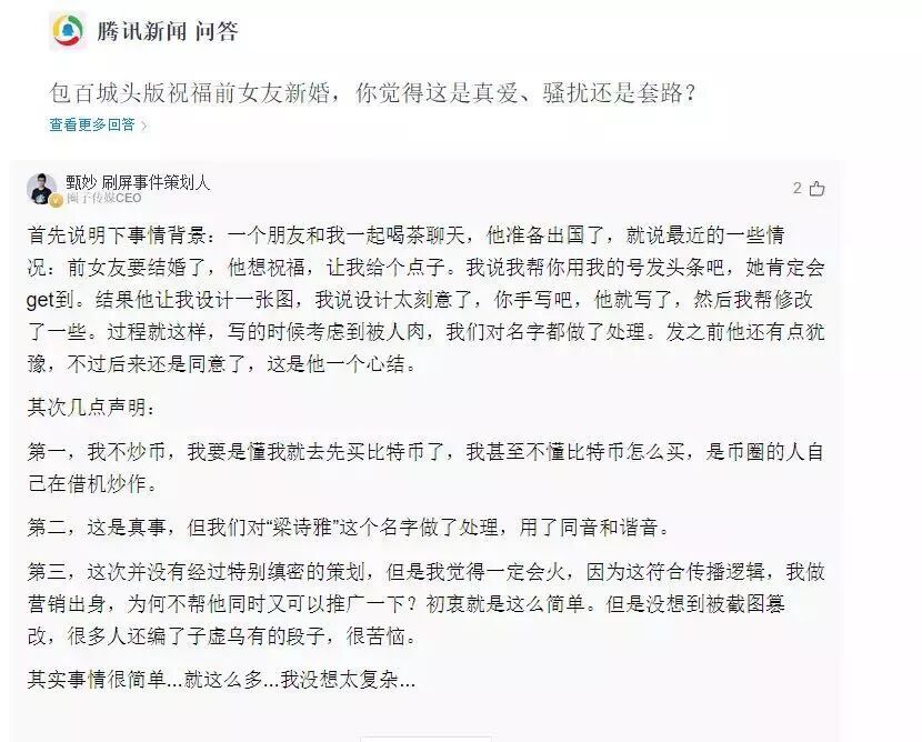 甄妙随后就在腾讯新闻App的问答板块做出公开回应,撇清了炒币的谣言,并且澄清这是一件未经缜密策划的真事:
