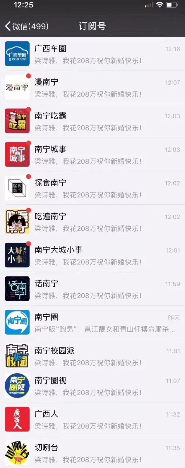 昨天中午12点开始,微信公众平台上的南宁城市号们,都推送了一篇《梁诗雅,我花208万祝你新婚快乐!》。