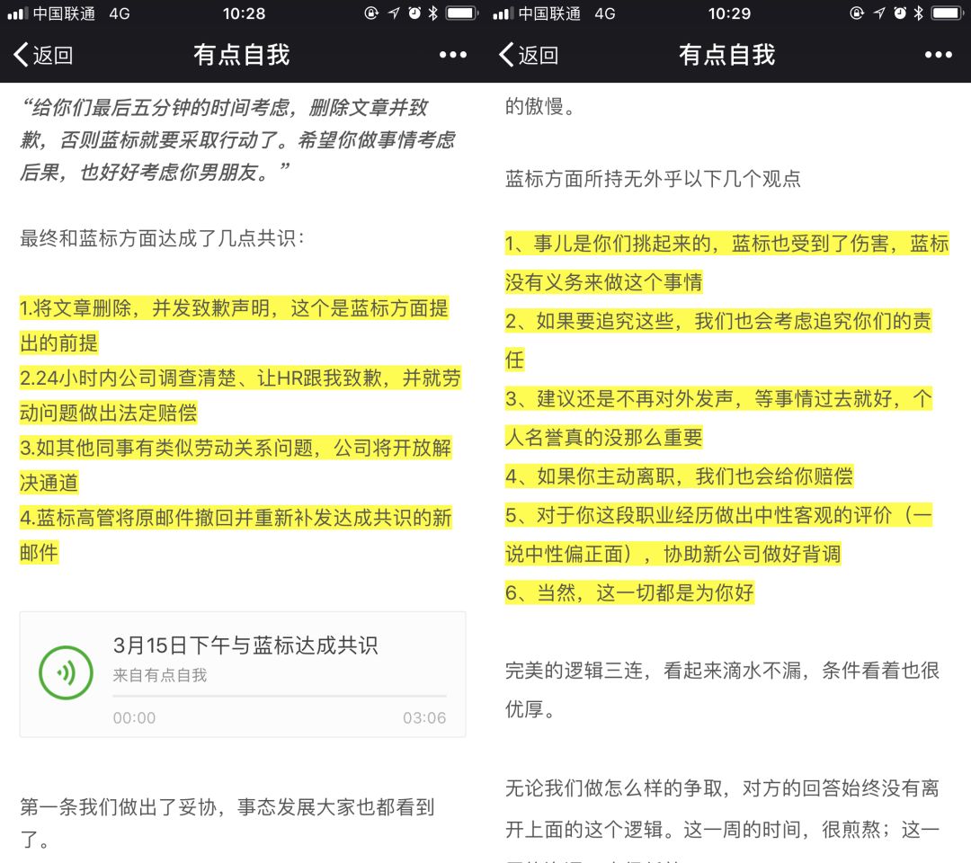 这个声明吊诡的地方在第4条“对于该员工的离职程序”这一行字。很明显这是一篇官气十足的声明,不出意外是蓝标官方自己写出来的,然后让该员工删了致歉声明后发布。可能是当“官”太久了,不懂得怎么“换位思考”,于是在写声明的时候,一不小心就暴露了自己的存在。