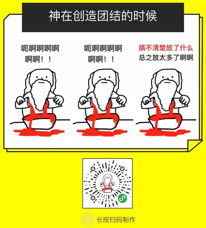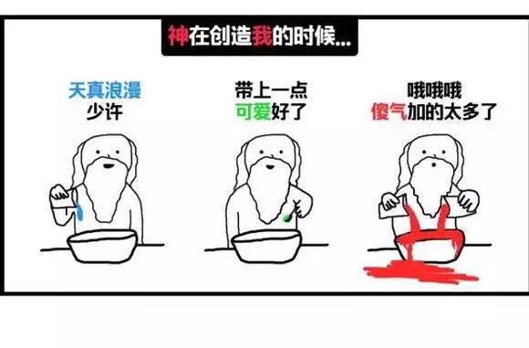 这是一个曾经在SNS和微博流传很广的漫画,被改编了很多不同的版本和形式。最初的版本是一个三格漫画,描述神在创造我的时候加了什么配料进去,内容有趣,充满自嘲,还有一点玄学的味道。