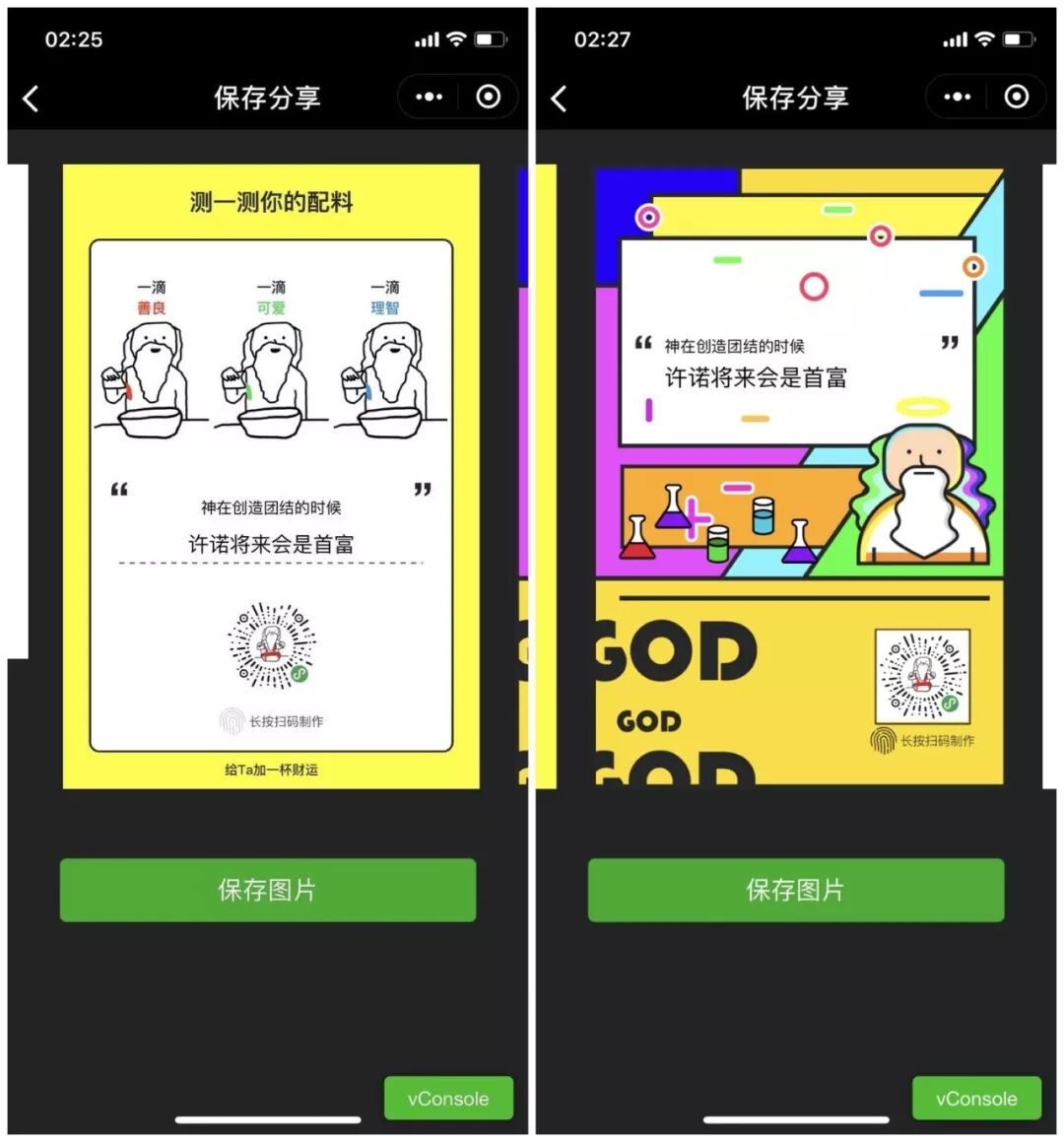 我们反思到一个问题就是,朋友圈是一个个人形象展示和情绪表达的地方,产品本身有着自嘲的味道,而且我们第一版生成的分享图过于幼稚,导致很多人保存下来却不愿意分享。