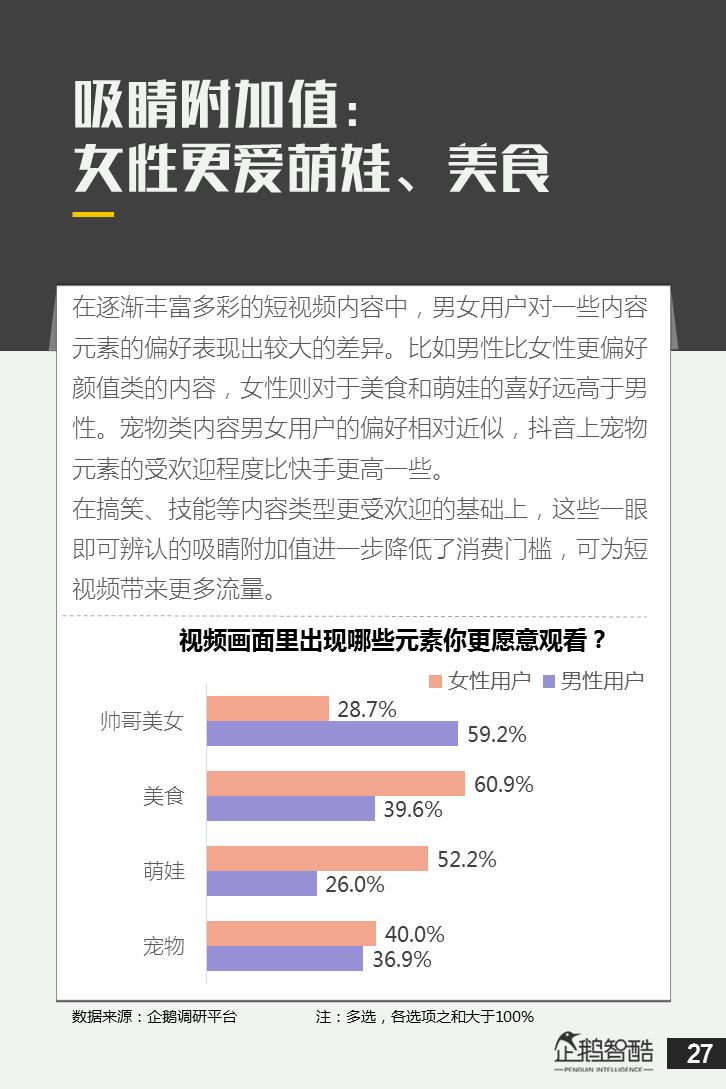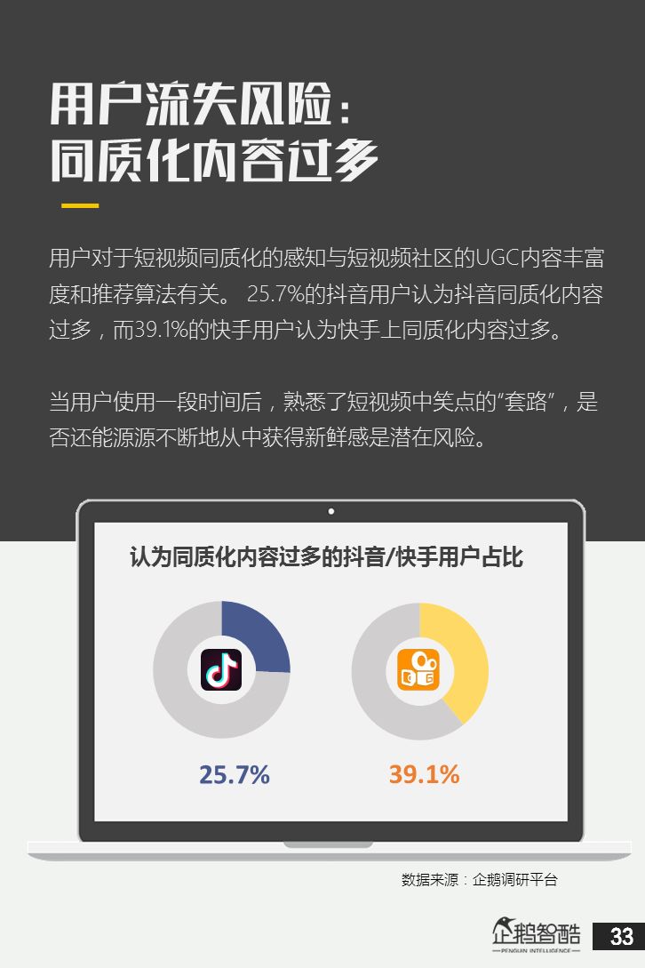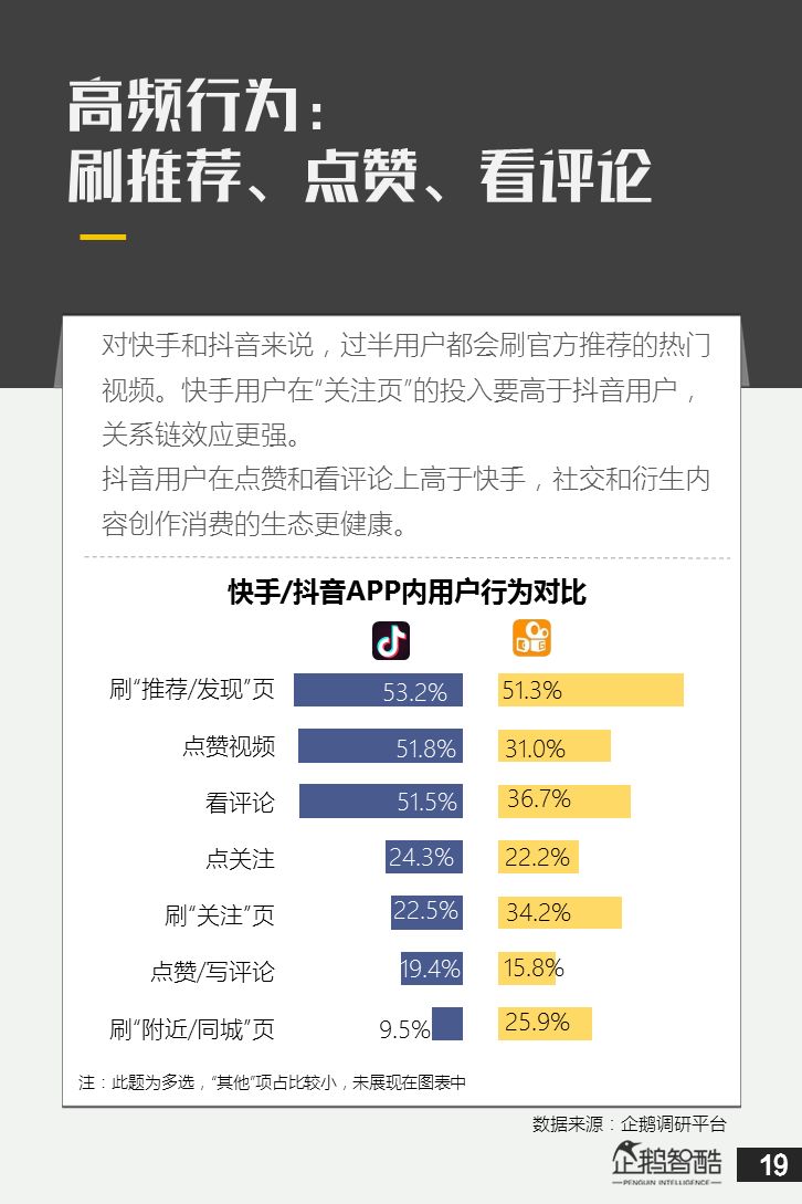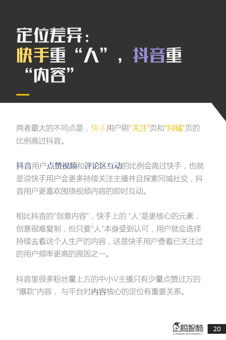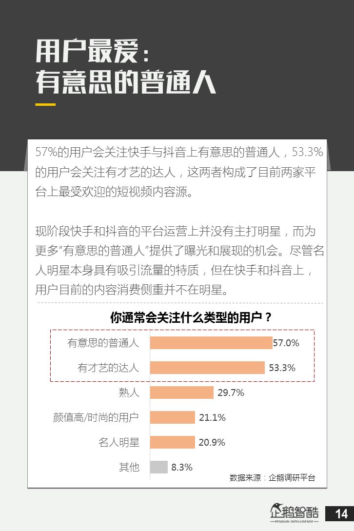 - 快手和抖音用户更喜欢关注有意思的普通人和才艺达人,在没有大规模引入流量明星的背景下,快手和抖音都实现了用户消费粘性的构建,这种相对去中心化的社区对于短视频创作者是利好;