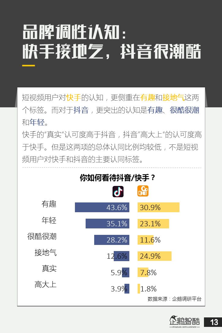 - 在品牌调性的认知上,短视频用户认为快手有趣和接地气,认为抖音潮酷和年轻;