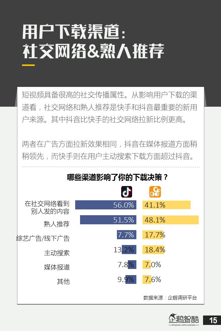 - 在用户下载渠道上,社交传播带来的转化效果非常显著。社交传播的“刷屏”影响力和熟人推荐的口碑效应往往可以带来新用户;