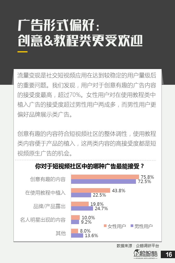 - 用户并不排斥内容有创意的广告。女性用户对于教程类内容更加情有独钟,而教程类内容很可能为原生广告所青睐;