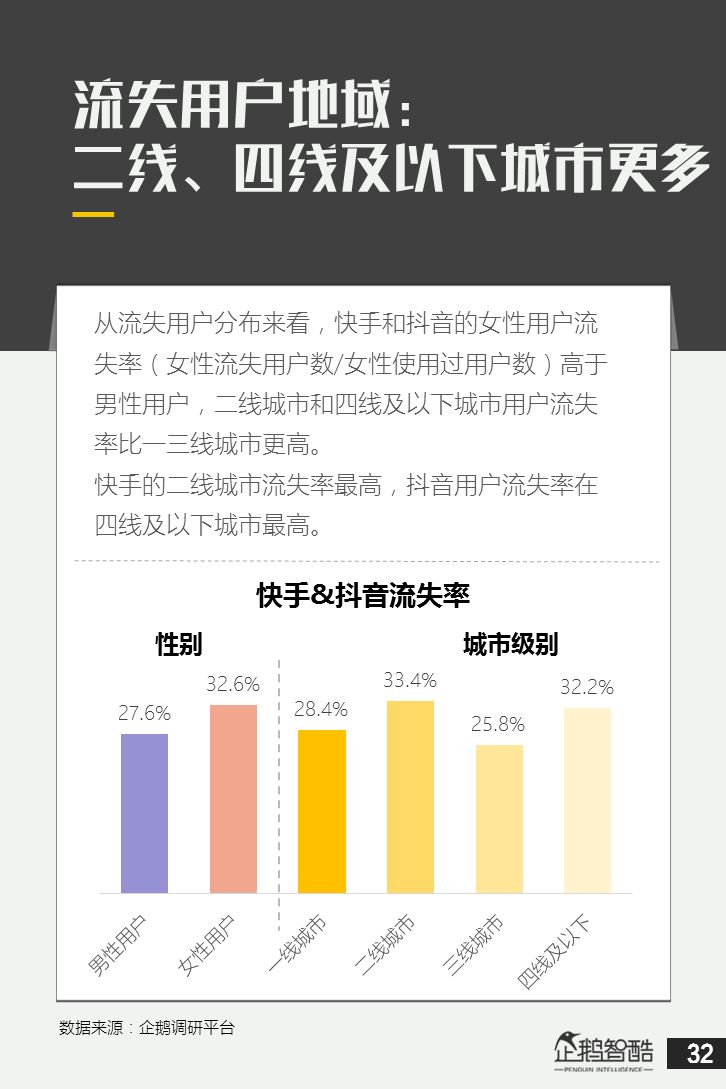 - 抖音在女性用户,年轻用户,高收入高学历用户,和一二线城市用户占比上高于快手,但并未形成明显的用户画像对立。两者的主要用户粮仓依然在非一线城市;