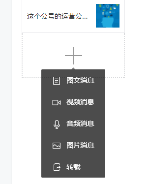 在素材管理中,新建素材的“图文列表”,平时可以显示全标题的列表,现在只能显示一行文字,在列表最后“+”字符的添加栏,编辑们可以直接选择添加“图文消息”“视频消息”“音频消息”“图片消息”和“转载”。