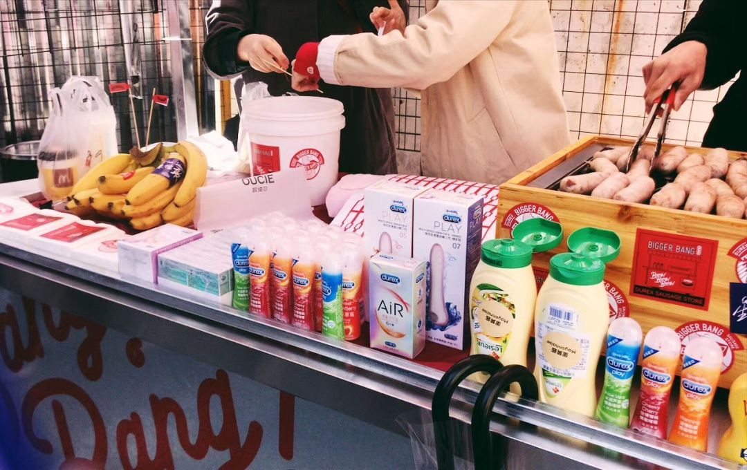 当然,香肠或香蕉什么的都不重要,因为蘸酱才是这家烤肠店的重点!与普通烤肠店不同,杜蕾斯推出自家果味润滑油,让食客们搭配品尝。
