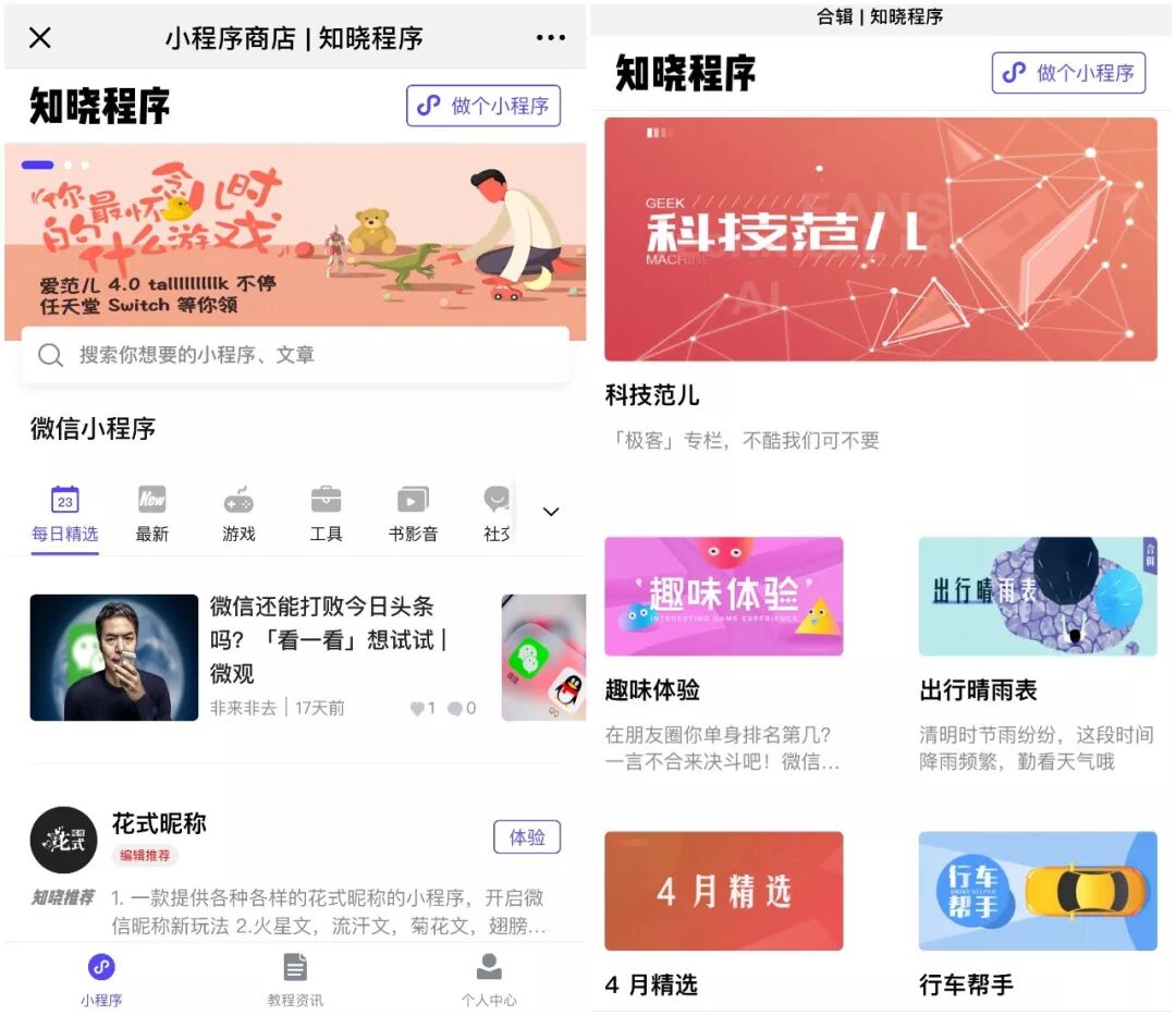 在知晓程序的商店首页,除了会发布如工具、社交、游戏、电商等各个类别的小程序之外,还有编辑精选的各类小程序专题,比如“科技范儿”、“趣味体验”,以及具有时效热点性质的“4月精选”和“一周新品速递”等栏目。