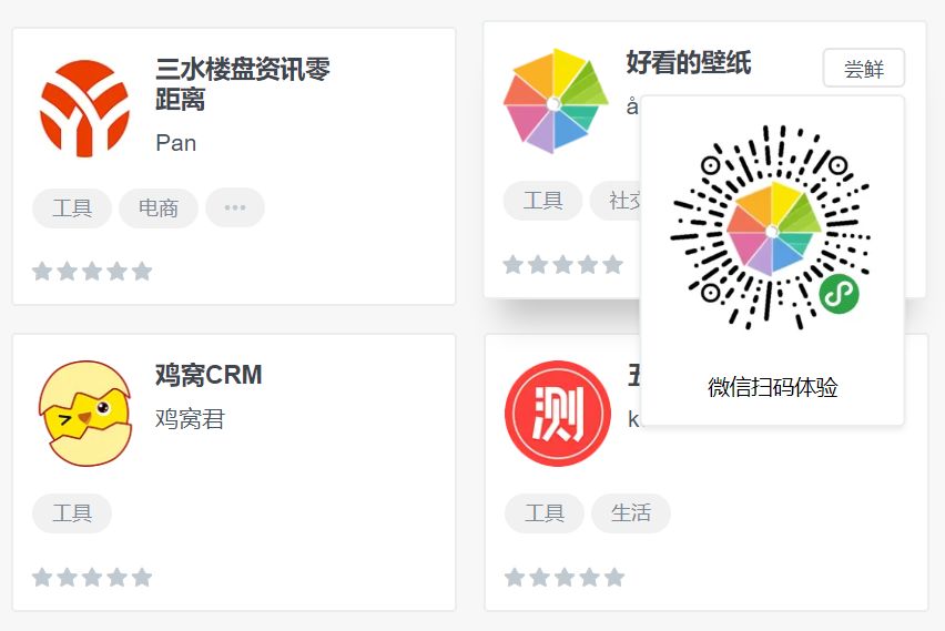 值得一提的是,在小程序商店的网页端,将鼠标放在小程序logo右侧的 “尝鲜”上,就会出现悬浮的小程序二维码,交互设计颇具美感。