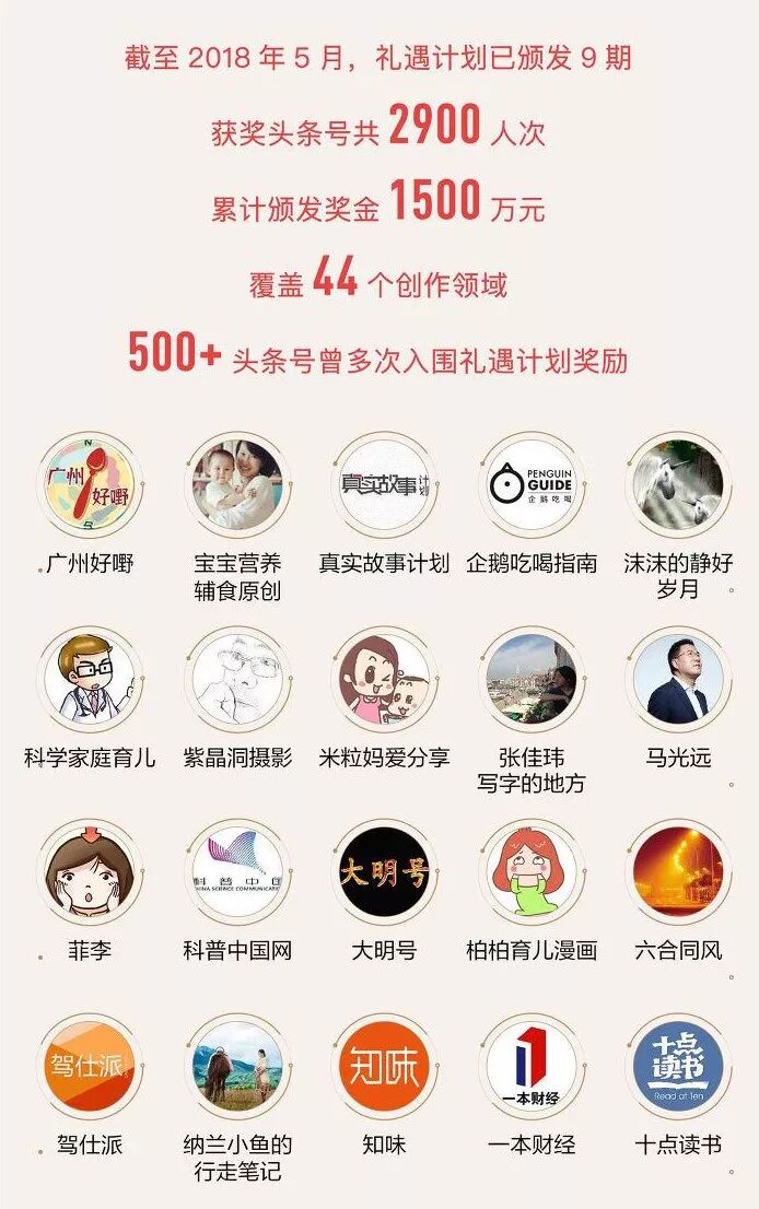 上个月,“礼遇计划”告一段落,头条号官方给出奖励补贴结果,超过2000个头条号获得1500万元奖金。