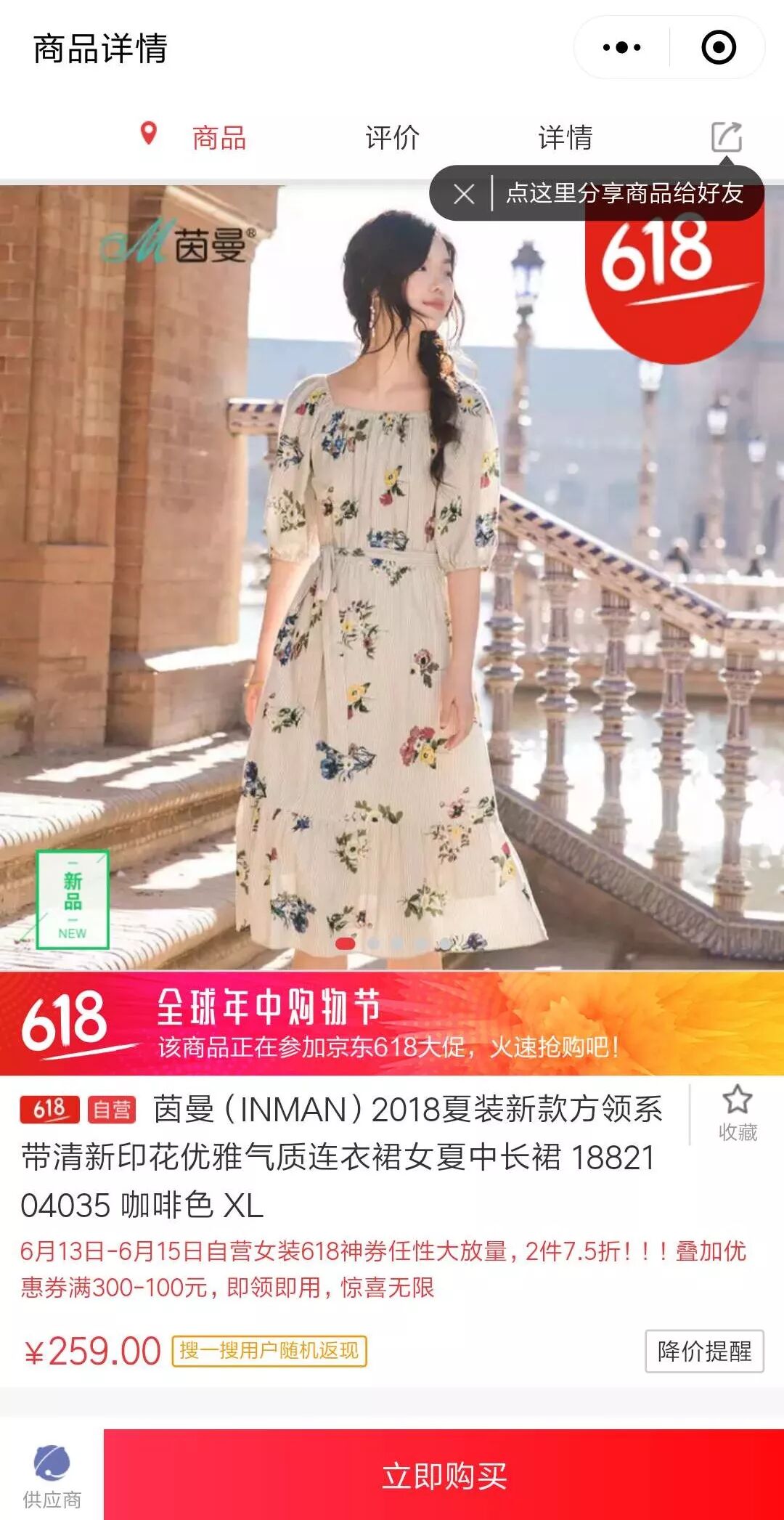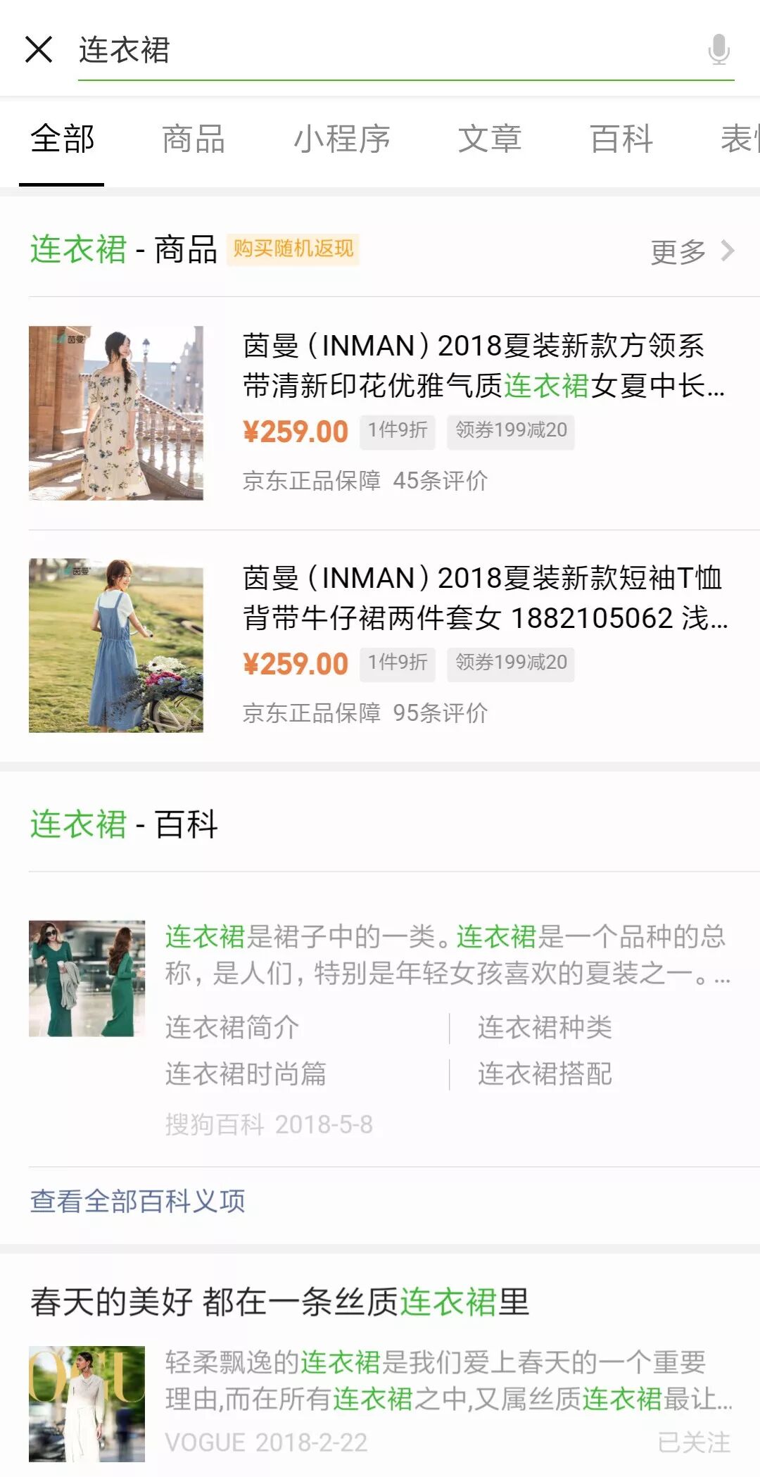 以“连衣裙”为例,在“全部”页显示两条搜索结果。除了商品名称、价格和评价数量外,还特别注明了“京东正品保障”。有优惠的商品还会标明优惠活动,如“1件9折”、“领券199减20”等。