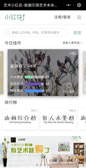 消费者浏览平台艺术品时,可按每个单独维度指数大小进行分类。例如按投资指数分类,该指数表明艺术作品可能会有升值空间,目前价格相对较低,是可以当作资产置入的指标之一。