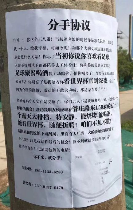 第三个是北京某烧烤摊的“分手协议”小广告。管庄路东150米,大叔去北京,一定要去这个烧烤店看看,太有才了。